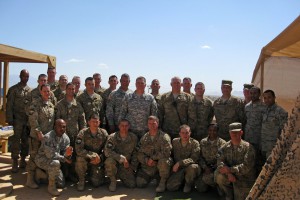 Brig. Gen. Glenn H. Curtis, the adjutant general of the Louisiana National Guard and Command Sgt. Maj. Tommy Caillier, the senior enlisted leader, visit Louisiana Airmen from the 236th Combat Communications Squadron, in Shindand Air Base, Afghanistan, May 9, 2012. The 236th deployed to Afghanistan in December and provides voice and data services.